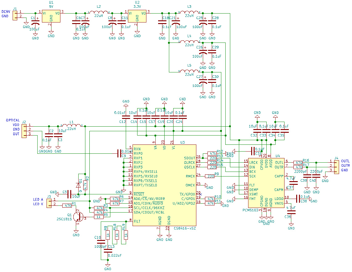 | 入力電源はDC6Vから9V程度のACアダプターを想定しているので、一旦5Vに落とす回路にしています。DDCにはCS8416を使用します。半導体不足のため、過去の製作品から取り出しました。DACは定番のPCM5102です。これも過去の使い回しです。どちらも使い易いICですね。光デジタル入力の部品は回路図上はピンヘッダーにしておいてフットプリントのみをWEBから探し出して使用しています。もちろんピン番号を合わせて配線してあります。電源回路のインダクタは好みですが精神安定剤には充分です。このDDCにはハイレゾ(96kHz)用のLED表示ポートがあります。今回使用していますが、通常のCD再生では点灯することはありません。 | |