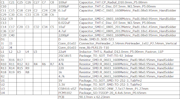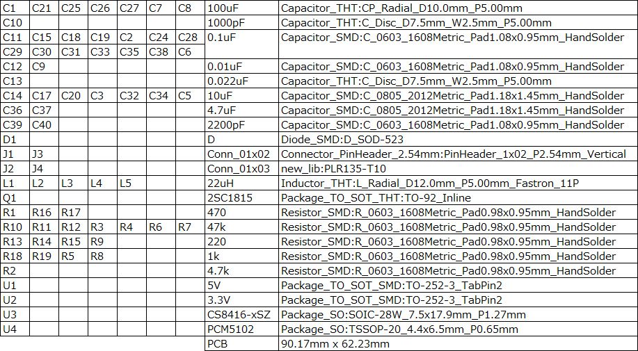 | 部品選定の参考になるようにフットプリント一覧を上図に記します。部品は秋月さんで揃うと思います。勿論手持ちもいくつか使っています。光デジタル入力素子は基板挿入タイプをと使いました。基板配置でそのままケース背面に出せるようにしています。ICを持ってない方はMouserなどから購入をお願いいたします。 | |