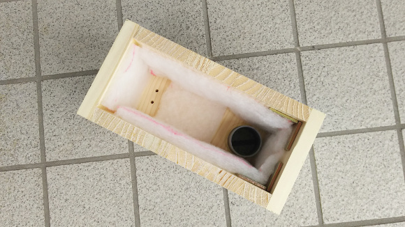 | 今回は板が厚すぎて細いクギが使えませんので、木工用ボンドのみでしっかりと接着して行きます。前面板を残して一気に接着するのがコツですね。紐で縛ったり、重石を置いたりして、接着面に隙間が出ないようにして下さい。 | |