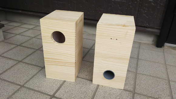 | スピーカー用の穴とバスレフポート用の穴は毎回自分で開けています。ずっと昔には日曜大工センターでも丸穴も開けてもらえたのですがね。 | |