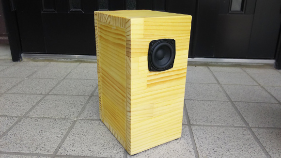 | 前面板を貼り付けて、エンクロージャーとしてひとまず完成です。ここからは仕上げとして、#120,#240の順で紙やすりで表面をなだらかにしておきます。コーナーな角を落としておくと良いと思います。 | |