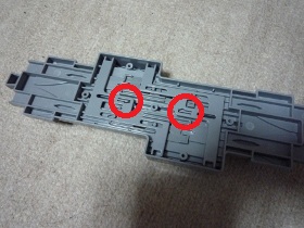 | クロスポイントとストップレールは通常手動コントロールするように出来ています。分解するとわかりますが、それぞれのポジションにストッパーになるものがあります。サーボでコントロールするにはこのストッパーが邪魔になります。上図の赤丸の部分にありますので、気持ちよく破壊(?)しておきましょう。 | |
