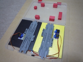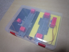 | プラレールの線路は分解出来て簡単に収納出来るので、電動のポイントも収納出来るケースを作っておきましょう。私は100均で厚めのA4ファイルのケースを使って作りました。これで移動も簡単ですね。 | |