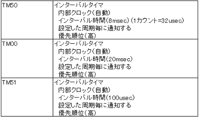 | TM00とTM51がサーボ制御のインターバルターマ割り込みに使います。TM50は今回お休みしています。 | |