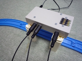 | 高架用の部品を用いて制御装置で線路をまたぐようにします。そうすることでACアダプターからの線が線路に邪魔になることなく、接続出来ます。 | |