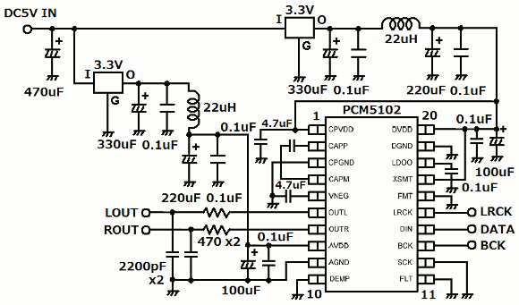 | DACは3.3V動作になりますので、電源回路も一緒に組み込みます。ラズベリーパイからのDC5Vを電源フィルターを経由してデジタル電源とアナログ電源に分けて供給します。 | |