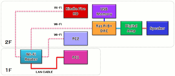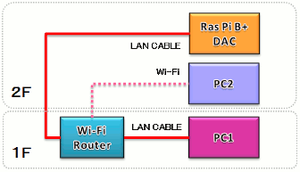 | volumioを導入したラズベリーパイはネット経由で操作します。上図は私の家のPCシステムですが、最初ラズベリーパイはLANケーブルでルーターに接続します。操作は同じルーターに接続されたPCから行います。この時私はPC2から操作していますが、ラズベリーパイ自信がLinuxで動いているためvolumioにはラズベリーパイに電源を入れても2分程度はつながることが出来ません。この部分が最初はなかなか理解出来ませんでした。あせることなく時間を待ちましょう。(HDMIケーブルでモニタを接続いてからラズベリーパイの電源を入れればOSが立ち上がっている状況が理解出来ると思います) | |