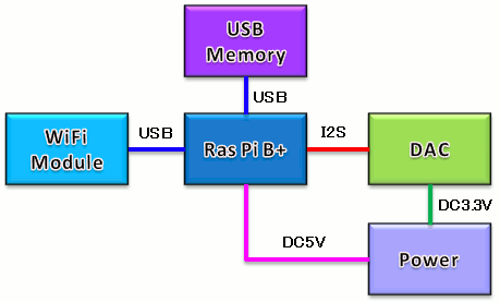 | ラズベリーパイの全体構成は上図の通りです。WiFiモジュールとUSBメモリーを接続します。volumioはマクロSDカードに入れてラズベリーパイに装着しています。 | |