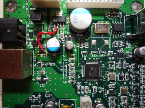 | 改造の回路図は記載出来ませんので、言葉で説明します。D4を取り外します。このダイオードはUSBコネクタからの電源があるかを電源ICに伝える役目があります。これが機能することでややこしくなっています。 | |