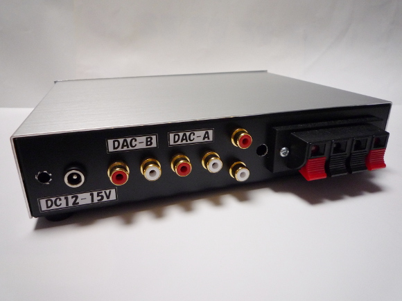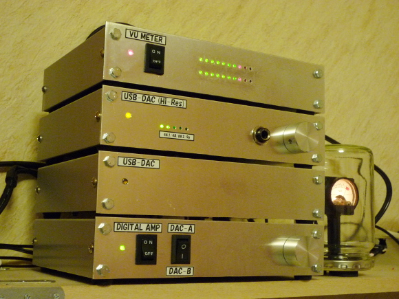 | USB-DACがふたつあるのに、現在の接続では前回製作したVUメーターをつなぐ方法は1種類しかありません。それではコネクタを差し換えたりして大変不便なので、前に作ったデジタルアンプを少し改造します。 | |