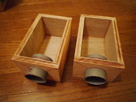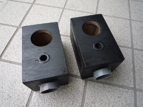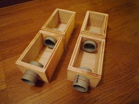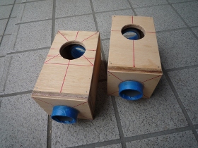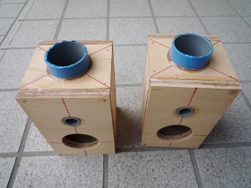 | 左側がバスレフ・ツイン型、右側がバスレフ・シングル型です。エンクロージャは二つに分かれており、その組み合わせを変えることで変化します。塩ビパイプをうまく活用することで、分割・結合を簡単に行えるようにしました。今回はフロア型を紹介しますが、この支柱部分も内容量に貢献しており、豊かな(?)低音の再生を可能にしています。 | |