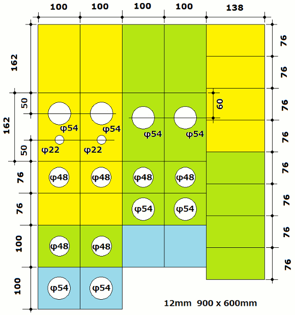 | 水色の板はデスクトップ型のベースになります。今回は使いません。板厚は12mmです。小型ですので900mmx600mmから取れます。 | |