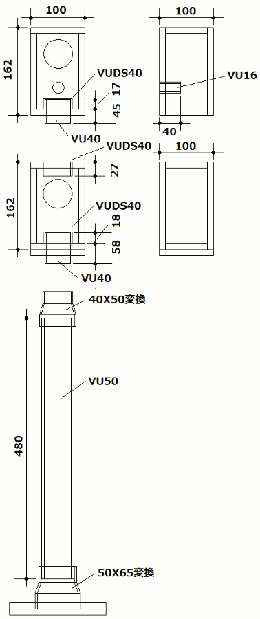 | 塩ビパイプは万能ボンドでしっかり取り付けます。構造図に描いてますが、VU40パイプはVUDS40でしっかり固定します。 | |