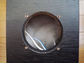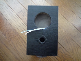| (背面には手芸の綿を少し。スピーカー取り付けは必ずガイド穴を) | |