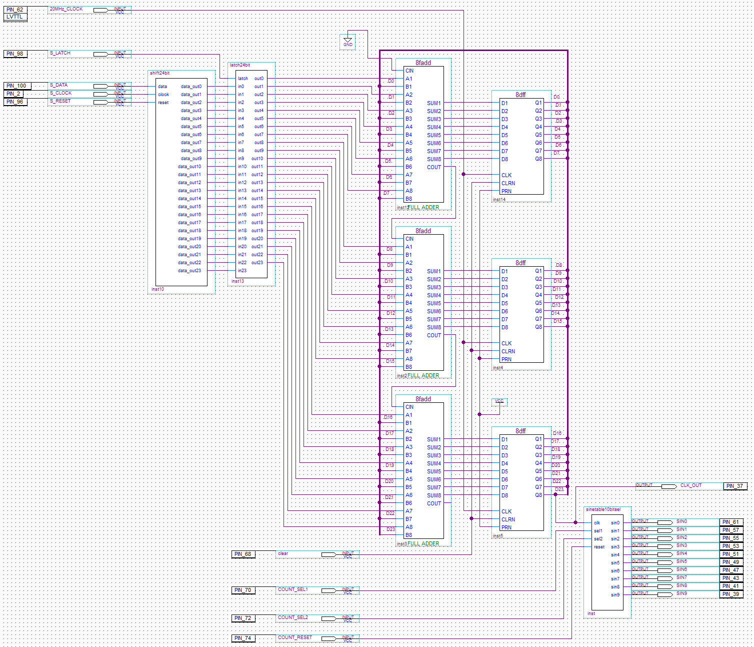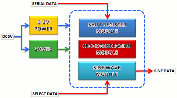 | CPLD基板の役割は大きく3つあります。 1)マイコンからの周波数設定のインターフェイスモジュール 2)正弦波のベースとなるクロックジェネレータモジュール 3)正弦波発生モジュール それぞれの詳細な理解については私の過去の記事を参照して下さい。 周波数カウンタ付きクロックジェネレータを作ろう |