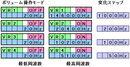 | VR1からVR4の4つのモードがあります。上図の通りにボリューム操作で周波数を変えることが出来ます。これらのモードはSW3を押すことで切換えます。VR2からVR4はオーディオに使い易いようにしたつもりです。オーディオ帯域を詳しく調べる時に便利と思います。ボリュームの位置と発振周波数は絶対値で対応していますのでボリュームを右に回しきった時に最高周波数となります。 | |