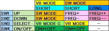 | スイッチ操作ではより細かい周波数設定が可能です。通常押しと長押しで変化ステップが変わります。VR1のボリューム操作モードの最高周波数は146kHzですが、スイッチ操作でこの発振器の最高周波数の156kHzまで変化することが可能です。まずはいろいろ操作してみるのが良いと思います。スイッチ操作からSW3を押すことでボリューム操作に戻ります。正弦波出力はSW4でON/OFF出来ます。 | |