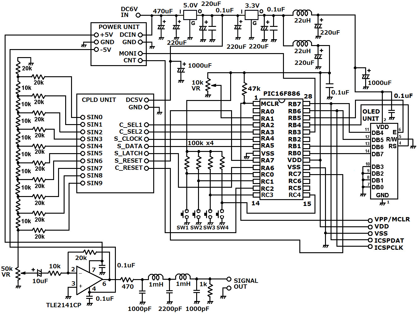 | 回路のポイントとしては、電源回路にDCフィルタを入れてノイズを防いでいます。今回の製作から最近購入したオシロ(DSO138)を使って電源回路のノイズレベルを測定して、ノイズが大きい箇所には電解コンデンサを追加しています。正弦波モジュールから出力される信号はOPアンプとフィルタを介して出力されます。OPアンプには±電源が必要になります。たまたまですが、DSO138の回路図に±電源の回路がありましたので、今回それを拝借させて頂きました。その関係から回路図中にある「POWER UNIT」の詳細回路は記載することが出来ません。原理としては極性反転型チュッパー回路で負電源を構成しています。マイコンからPWM信号でこの回路が適正となるように制御しています。負電源の電圧をマイコンでモニターしてPWM制御に反映しています。(電源投入時のみですが) | |