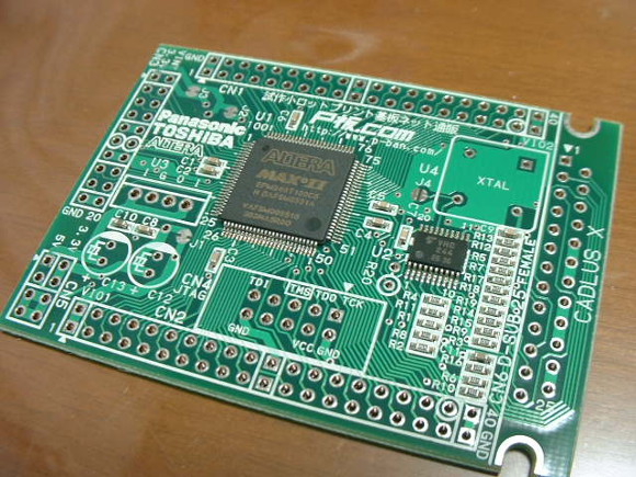 | 当時の付録のCPLD基板の写真です。この時はCPLD基板とPCをパラレルケーブルで接続してCPLDの開発を行っておりました。現在のPCにはそのような端子はないので、このCPLD基板では開発が出来ないと思われがちだと思います。しかしながらそんなことはないのです。今でもこのCPLD基板の開発は可能です。当時から基板にもこの時既にコネクタのランドが用意してあったのです。上写真手前の10ピンのコネクタ部分です。そうです今でもこのJTAGインターフェイスを通して開発が可能なのです。 | |