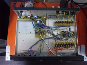 | 各機器に対して2系統の制御を行います。またステレオ音声ケーブルを使ってコントロールしたい思いもありましたので、上図のような回路図を考えました。 フォトカプラをはさんで右側が各機器への内蔵回路、左側がスリープタイマー側への内蔵回路です。原理はスリープタイマー側から各機器の電源ボタンを直接コントロールします。電源が立ち上がれば別ルートのラインを用いてシリアル信号で機器を制御します。この回路が出来た段階でこの製作は7割り完成したも同然ですね。 |