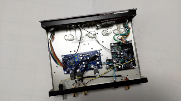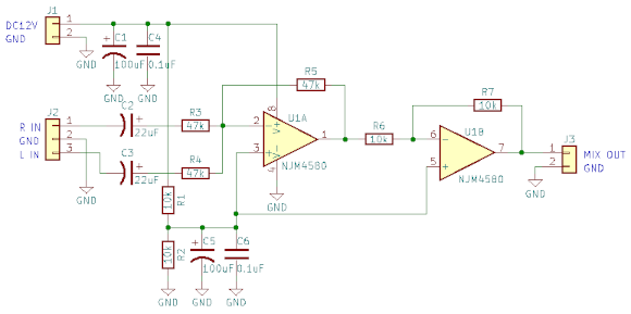 | まずこのモノラル出力はスペクトラムアナライザーの表示とサブウーファー用アンプに接続されます。簡単な回路にしているため、信号の電圧レベルが低いという状態でした。どちらもボリュームを介して接続しているのである程度の調整は出来たので、実用上は問題が無かったのですが、回路を変更してゲインを持たせることで、レベルが低いという状態を解決しました。 | |