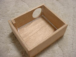 | いっきにここまで組み立てます。木工用ボンドはたっぷり塗りましょう。この後、サイドの板を取り付ければ箱は完成です。このままボンドが乾くまで一晩重石(雑誌など)をして置いておきましょう。 | |