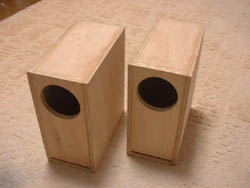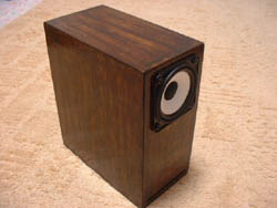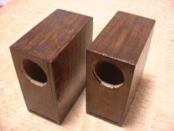| ここからは趣味の領域になりますが、私の場合はニスで仕上げました。 まず紙ヤスリでコーナー・面の角・ザラザラの仕上げをします。100均で紙ヤスリとホルダーを売っていますのでそれを使用すると大変便利です。 その後、透明ニスを2回程度下塗りします。充分乾かした後更に細かい紙ヤスリで仕上げをします。その後黒めのニスで仕上げをしましょう。2回程度塗った後細かい紙ヤスリで仕上げて更に2回程度塗れば黒光りしたエンクロージャーが完成します。 |
