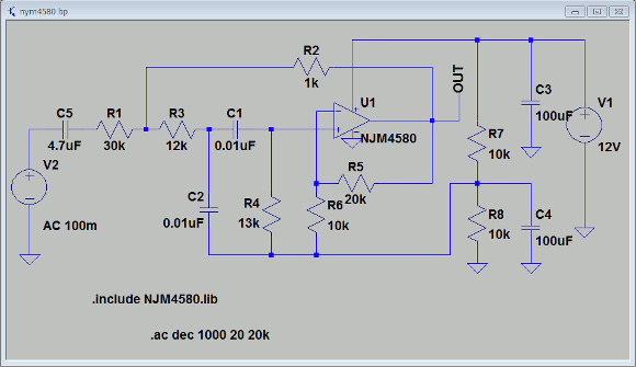 | バンドパス・フィルタはOPアンプで構成します。この回路構成とフィルター周波数計算はWEB記事を参考にしました。この場を借りてページ作成者の方に感謝いたします。 | |