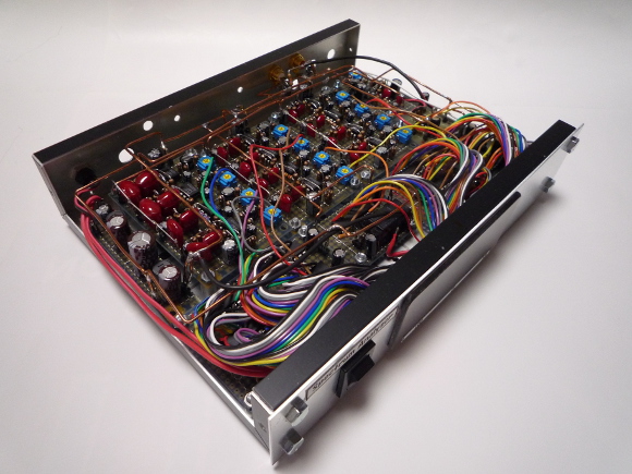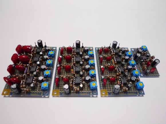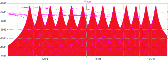 | ステレオ信号をMIXした後、バンドパスフィルターを通して、VUメーターに接続している、という構成です。ここはバンドパスフィルターをどれだけ用意するかで、仕上がりの高級感が異なると思います。世間には7バンドクラスの専用ICがありますが、どうしても迫力に欠けるような気がします(あくまでも個人的な見解です)。そこで今回は13バンドのバンドパスフィルタを構成しました。 | |