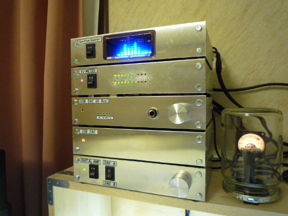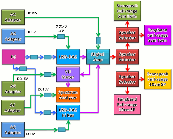| LEDはアナログ的に点灯するので、上に行くほど薄くなります。これはマイコンからデジタル表示的にLEDを点灯させているVUメーターには真似出来ない部分です。音楽との連動性を取るために、LEDの点灯レスポンスをかなり速くしています。この辺りは個人的な好みもあると思いますので、ダイオードで整流した後にプルダウンしている1kΩの抵抗値を各自の好みにして下さい。最後に現在のオーディオシステムをまとめておきます。 | |