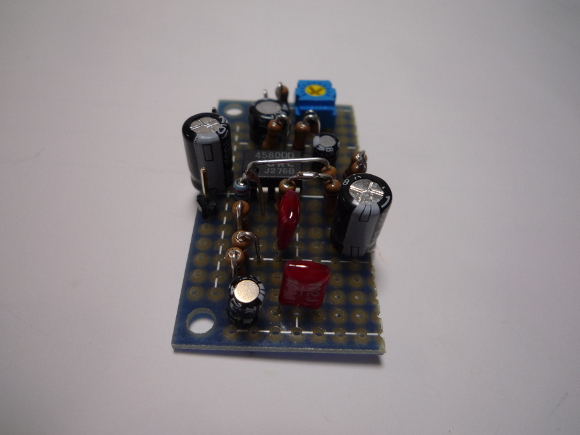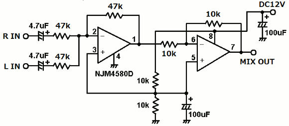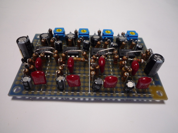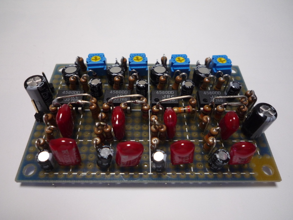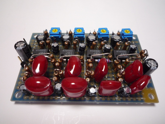 | ステレオ信号はMIXしてバンドパス・フィルターに渡しますので、この部分もOPアンプで構成します。少しゲインがありましたので、最終的にはVUメーターの入力ボリュームで調整します。 | |