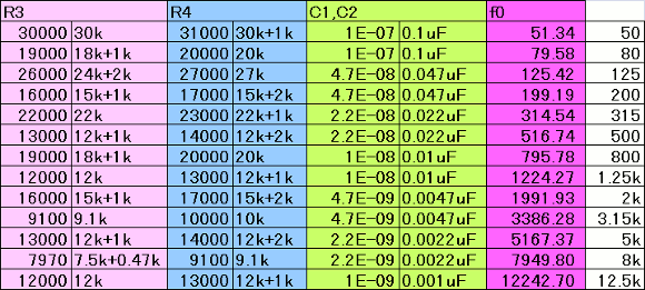 | WEB記事を参考に13バンドの周波数を決定しました。コンデンサをある程度固定して周波数に合う抵抗を決定していきます。 | |