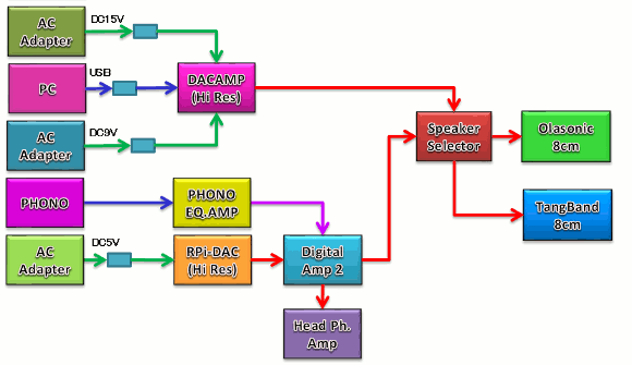 | この部屋にはディスクトップ用として「Olasonic 8cm」を、フロア用として「TangBand 8cm」のスピーカーを配置しています。それぞれPC経由の再生系と、アナログプレーヤー・ラズパイ経由の再生系が接続されています。それぞれが独立しているですが、たまには違うスピーカーも接続したくなるので、今回スピーカーセレクタを製作しました。セレクタというよりは、スイッチャーといったほうが良いかもっしれません。それぞれの機器に対してスピーカーを交換出来る機能を持っています。 | |