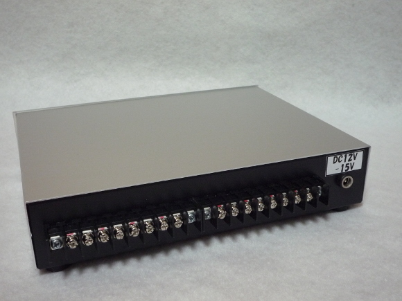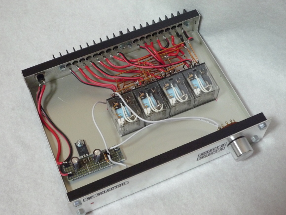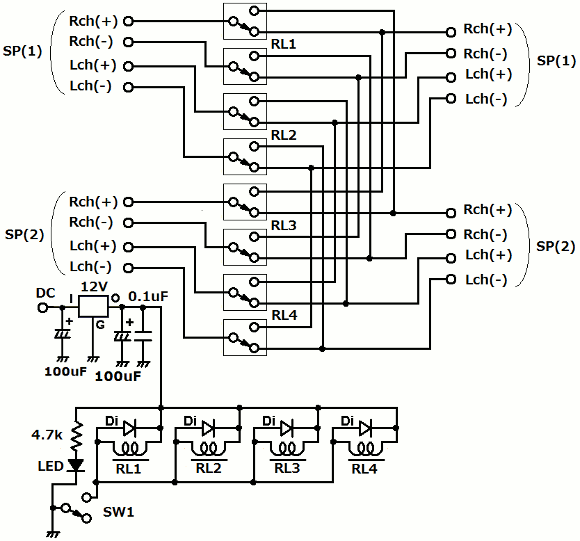 | スピーカーの配線全てをパワーリレーで切り替えます。パワーリレーは4回路ですが、2回路づつを同一配線として使用します。回路図の通り、二つのスピーカーを切り替えるのに4つのパワーリレーを使用しました。ダイレクト接続(SP1⇒SP1、SP2⇒SP2)の時はリレーに電流は流れていませんが、クロス接続(SP1⇒SP2、SP2⇒SP1)の時には電流が流れています。パワーリレーはDC12Vで動作するので、電源回路に12Vのレギュレータを使用しています。電源はDC12V〜15V程度のトランスタイプのACアダプターを使用するのが良いと思います。 | |