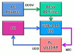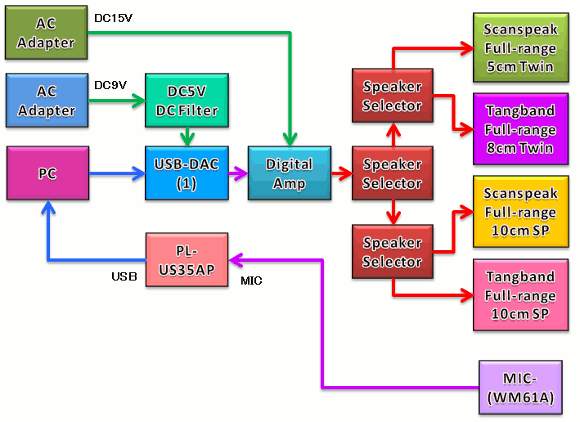 | ご覧のようにUSB変換装置の周波数特性は、ほぼフラットのようです。それでは測定時のシステム全体を記します。 | |