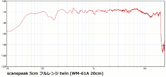 | スピーカーから出る音をマイクで拾ってUSB変換してPCに入力します。これでほぼ正しく測定出来ていると思います。それでは順にその結果を記します。まずは前回大コケして作り直したスピーカーからです。 | |