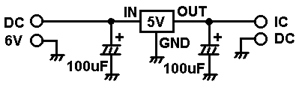 | このICには5Vの電圧が行くように、電源回路も組み込みます。 | |