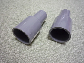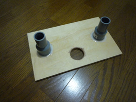| まずはバスレフポートを取り付けます。今回は簡略化するために水道管を使用しました。太いものと細いものをジョイントするためのパイプです。 | |