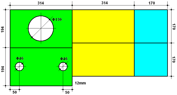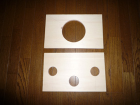 | ベニア板は12mm厚としました。丸穴は自分で開けます。D級アンプ基板を入れる穴は記載しておりませんので、皆さんの製作に合わせて下さい。 | |