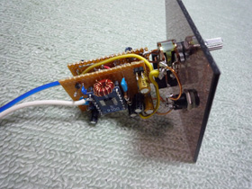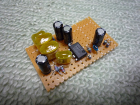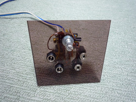| ほとんど空中配線です。太めのエナメル線を用いて基板を入出力端子に接続します。 | |