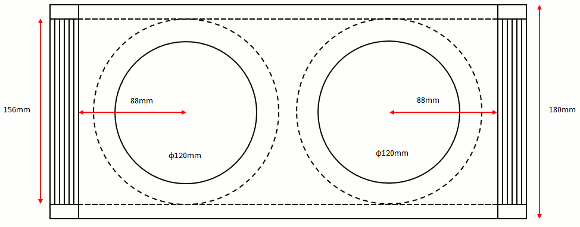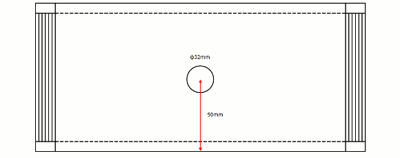 | 前面にはφ120mmの穴を2個、背面にはφ32mmの穴をあけます。位置は図面を見て下さい。なんとなくバスレフポートの穴が小さいように思いますが、一応計算して確かめてはいます。 | |