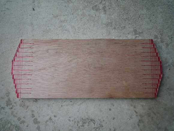 | 今回もエンクロージャーには12mm厚の合板と12mmの角材を使用します。900mm x 450mmの板から、まずは図面通りの寸法で、天面、底面、正面、背面の板を切り出します。まずは天面と底面の板を加工します。 | |