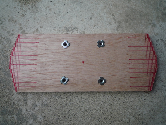 | 角材を接着する位置が判るように線引きとマーキングを行い、四隅の不要な部分をカットします。底面にはエンクロージャーと支柱を接続するための部材をネジ止めするためのつめ付ナットを埋め込みます。これは後ほど説明する接続部材の穴加工寸法に合わせて下さい。今回はM8を使用してよりしっかりと接続させます。 | |