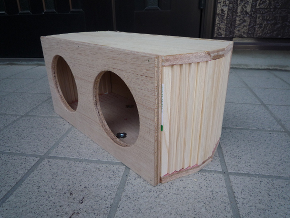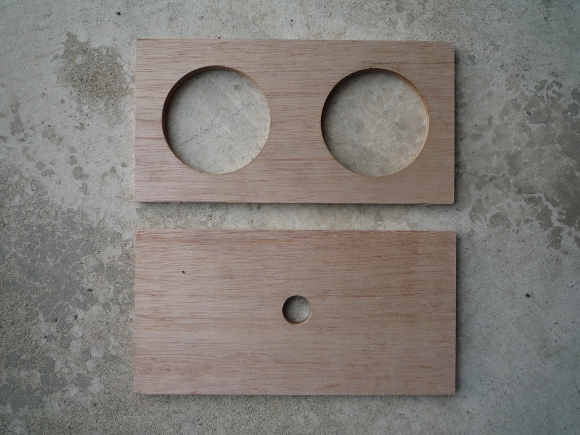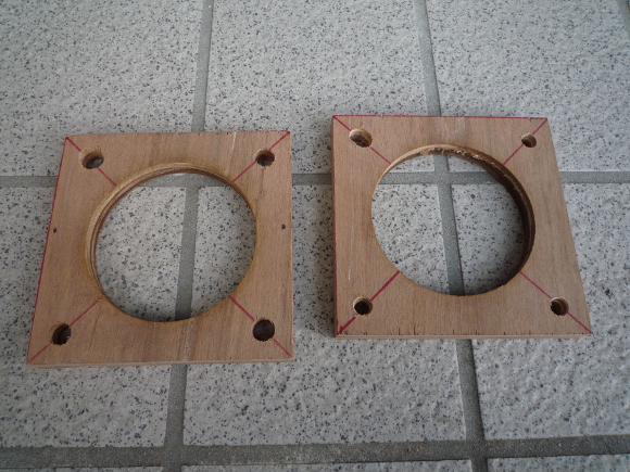 | 15mm厚の合板から切り出し、穴加工を使います。今回はエンクロージャーがかなり重くなりますので、その重量に耐えられるだけのものにしたつもりです。 | |