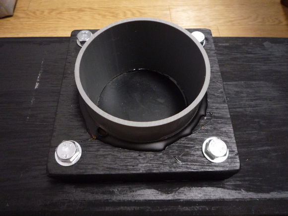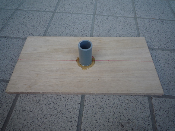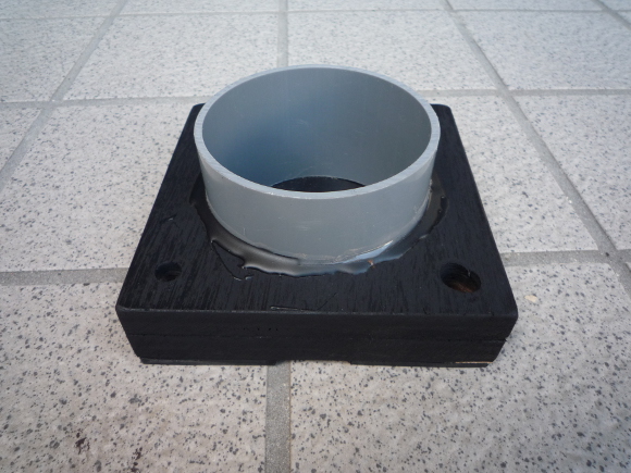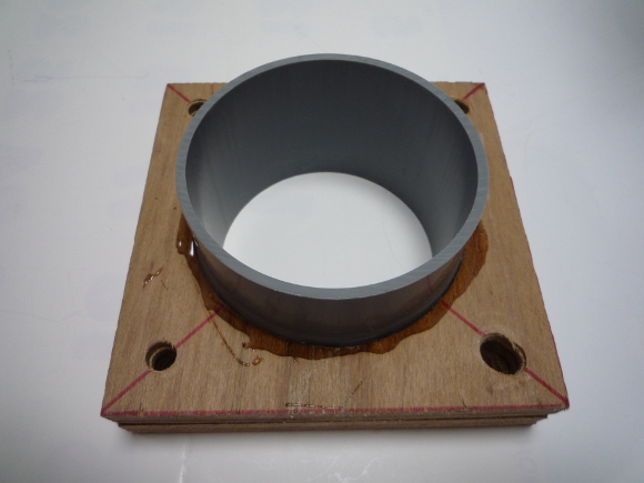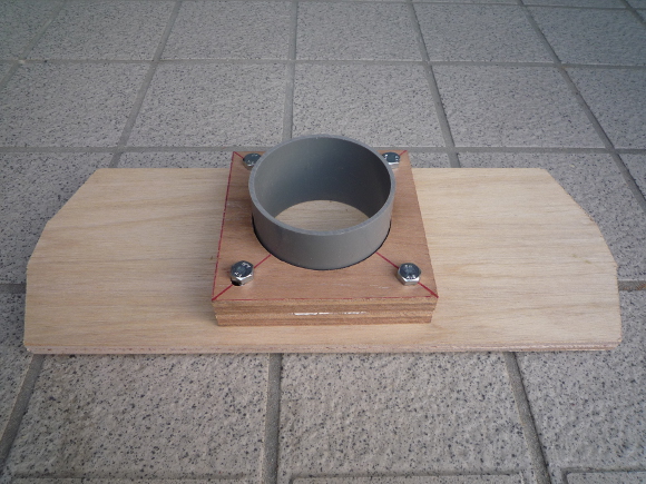 | 合板を木工用ボンドで張り合わせて、VU75の塩ビパイプを60mmにカットしたものを万能ボンドで接着します。まずここで底面の埋め込みナットと位置確認を行います。 | |