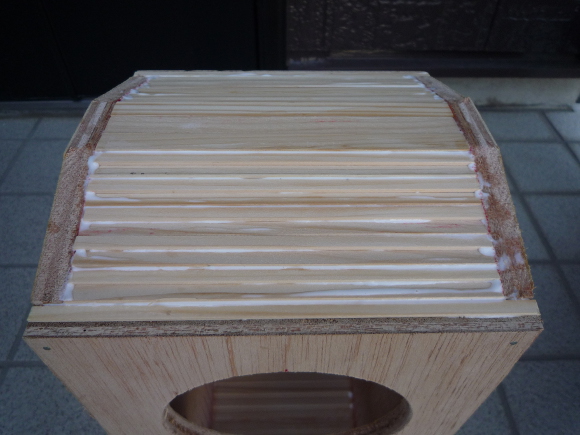 | (木工用ボンドで接着しながら角材を積み上げていきます) | |