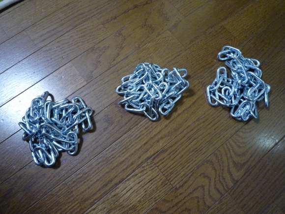 | そこで塩ビパイプに鎖を入れて安定化させましょう。3m分を1mづつカットして購入します。そのまま塩ビパイプに投入して下さい。 | |