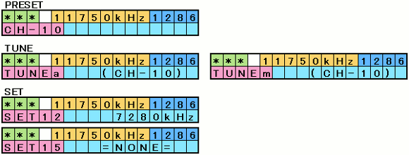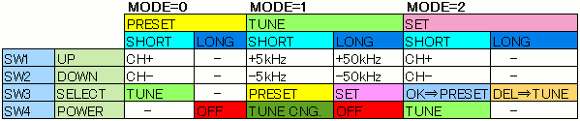 | 初期プリセットとしてCH00に12130kHzが設定されています。これはプリセットの設定、削除のソフト処理を簡略化するためのもので変更することは出来ません。同調の自動制御については正確にプログラムしていますが、局発の周波数制御については選局時順次学習するのであらかじめ組み込んでいるソフト処理部分はかなりラフになっています。後述する「AUTO SCAN」を使って最初にある程度調整するほうが良いと思います。 | |