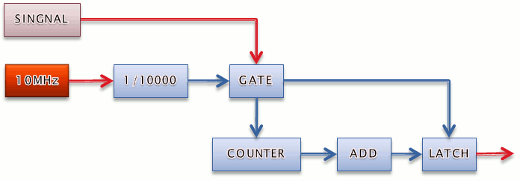 | 周波数が異なるだけでいつもの構成図と同じです。相変わらず周波数はCPLDで測定してマイコンに渡します。CPLDは「トランジスタ技術2006年4月号」の付録を使用します。当時相当数のトラ技を買っていたのと古い製作から蘇らすことで使用を続けております。 | |