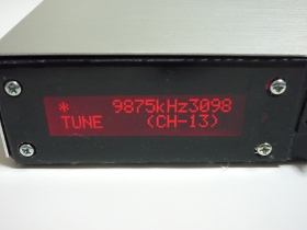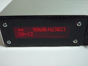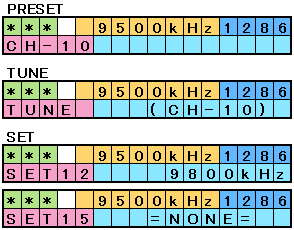 | 表示左下がモード表示です。上の行で周波数を表示します。その右側には局発電圧を設定するためのA/Dコンバータの値を表示してします。デバッグ時に必要だったのですが、そのまま残しました。基本的な操作の仕方としては「TUNE」モードで受信出来る周波数を選択してモードを「SET」に変更して好きなCHにプリセットするという手順です。 | |